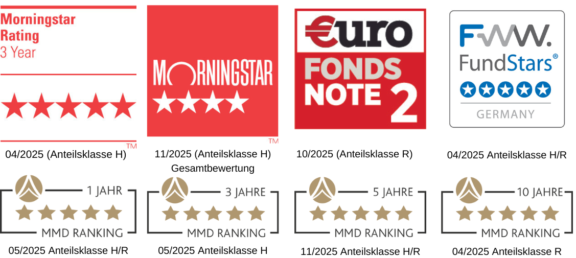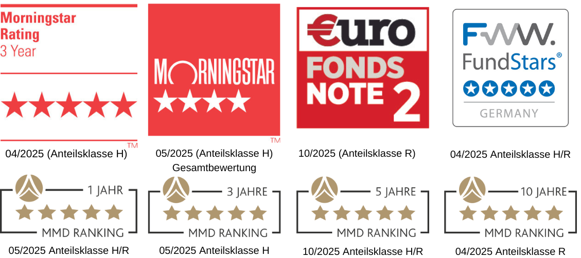 Morningstar Rating™ Gesamt: © (2022) Morningstar Inc. Alle Rechte vorbehalten. Die hierin enthaltenen Informationen: (1) sind für Morningstar und/oder ihre Inhalte-Anbieter urheberrechtlich geschützt; (2) dürfen nicht vervielfältigt oder verbreitet werden; und (3) deren Richtigkeit, Vollständigkeit oder Aktualität wird nicht garantiert. Weder Morningstar noch deren Inhalte-Anbieter sind verantwortlich für etwaige Schäden oder Verluste, die aus der Verwendung dieser Information entstehen. Ratings bezogen auf den Vormonat. Stand: 09.2022